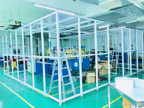 潔凈棚采用工業鋁材(或不銹鋼方通、鐵方通噴塑)作為框架,風機濾網機組(FFU)送風,四周懸掛防靜電垂簾(或鋼化玻璃),其內部凈化級別可達到100-10000級。適用于操作區內局部凈化級別要求高的區域。