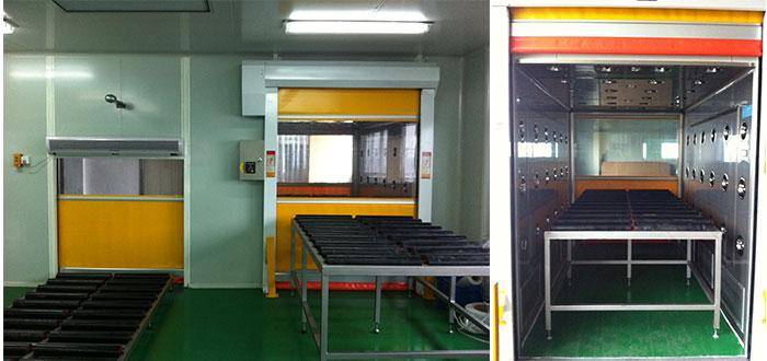 4、快速卷簾門流水線貨淋室(自動(dòng)感應(yīng)控制快速卷簾門),流水線可做成整體一條線,門下降時(shí)接近流水線,也可將流水線分成三部分;