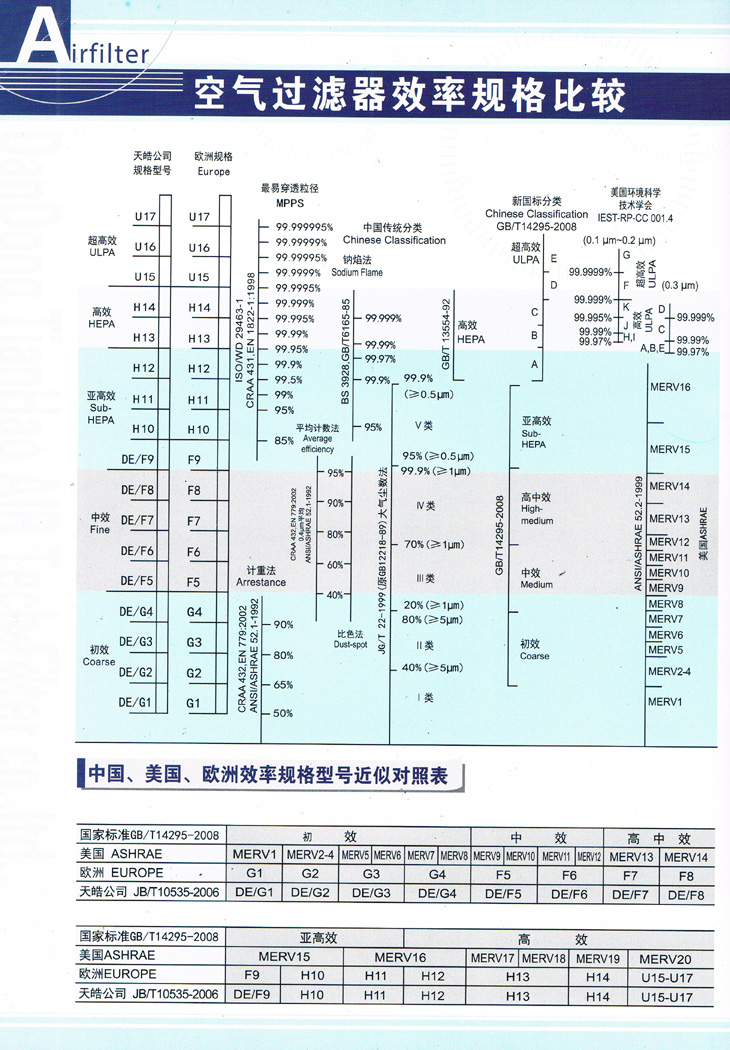 國內外最新空氣過濾器效率規格表: