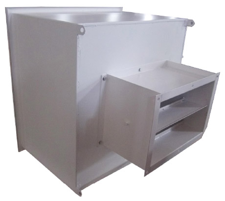 位于箱體底部的蝶閥調節裝置與蝶形風閥之間由一根金屬調節細桿相連??芍苯訌牡撞啃D此裝置以控制蝶閥,使得調節進入室內的風量變得簡單方便。 液槽式高效送風口(液槽密封)箱體結構